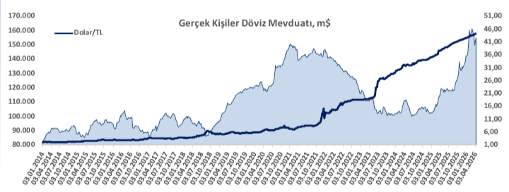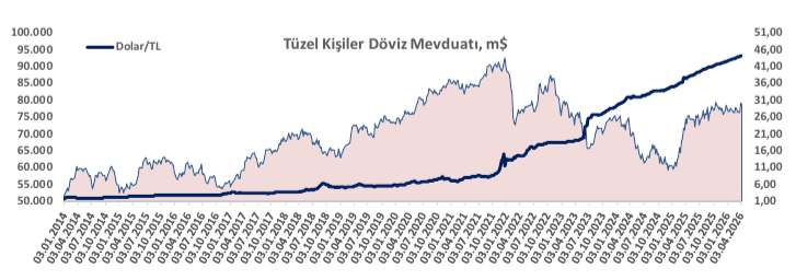 Analizde, 2025 yılı başından itibaren yurt içi yerleşiklerin döviz mevduatında genel eğilimin artış yönünde olduğu belirtildi. Aynı dönemde TL mevduatların 27,5 milyar TL azalarak 15,49 trilyon TL seviyesinde gerçekleştiği aktarıldı.